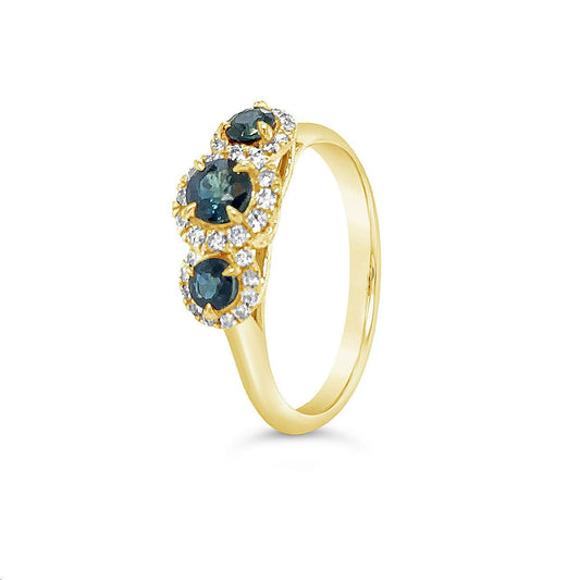 9k Yellow & White Gold 3 Stone Sapphire & Diamond Halo Dress Ring