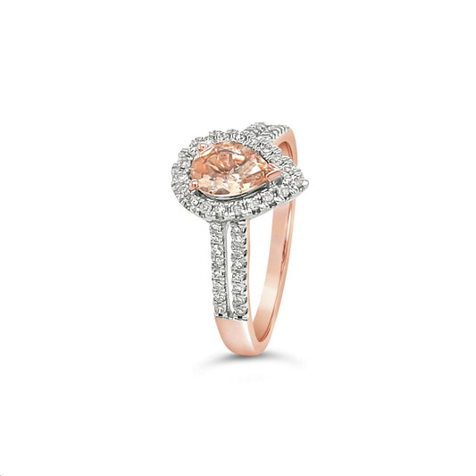 9k Rose Gold Pear Shape Morganite & Diamond Halo Ring